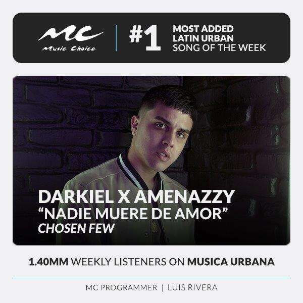 Darkiel X Amenazzy X Boy Wonder CF celebran la noticia de que el tema «Nadie Muere De Amor» es la canción mas solicitada en Music Choice esta semana, estrenando la posición #1 de las carteleras. El tema que fue lanzado hace muy poco ya se ha convertido en una de las favoritas entre la fanaticada de los cantantes.