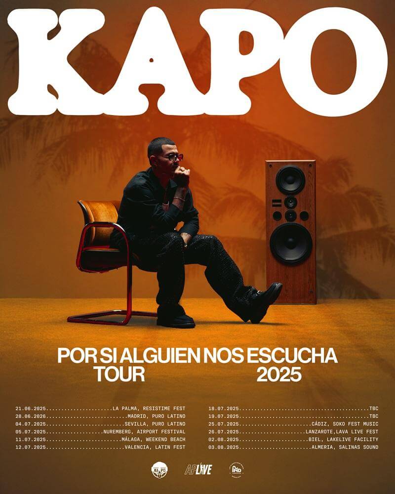 El recorrido, que inicia el 21 de junio en La Palma (Resistime Fest) y finaliza el 3 de agosto en Almería (Salinas Sound), incluye paradas en ciudades clave como Madrid, Sevilla, Valencia, Málaga, Cádiz, Lanzarote, Biel y Nuremberg, y forma parte de una estrategia de consolidación que reafirma el crecimiento sostenido de Kapo en la escena internacional.