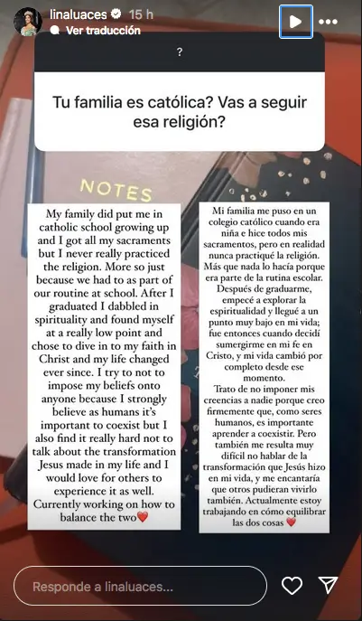 “Después de graduarme empecé a explorar la espiritualidad y llegué a un punto muy bajo en mi vida, fue entonces cuando decidí sumergirme en mi fe en Cristo y mi vida cambió por completo desde ese momento”, detalló Lina.