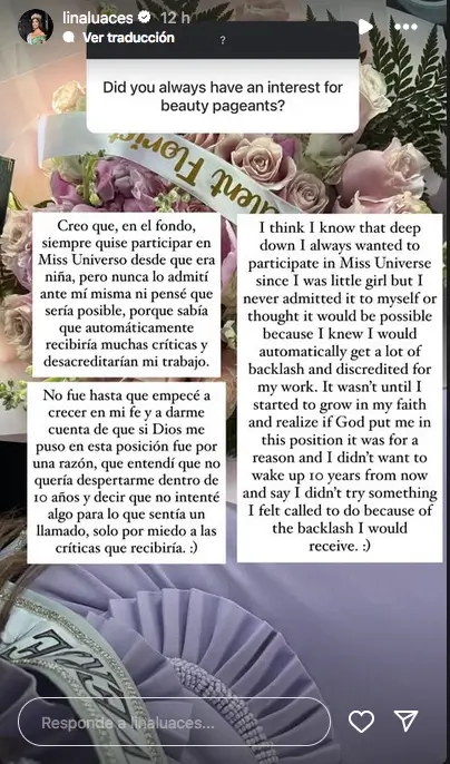La modelo Lina Luaces, quien es hija de Lili Estefan y representará a Cuba en Miss Universo 2025, se sinceró con sus más de 360,000 seguidores de Instagram sobre diversos aspectos de su vida, así como de su reinado.
