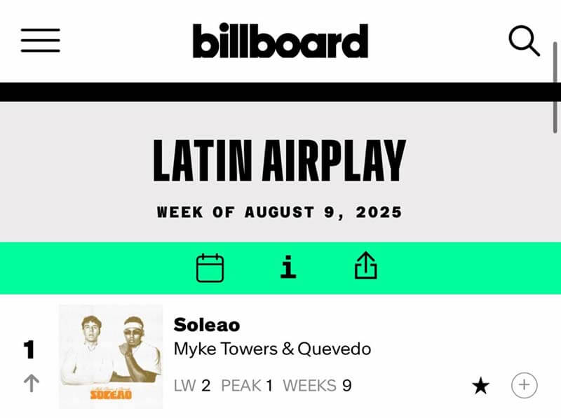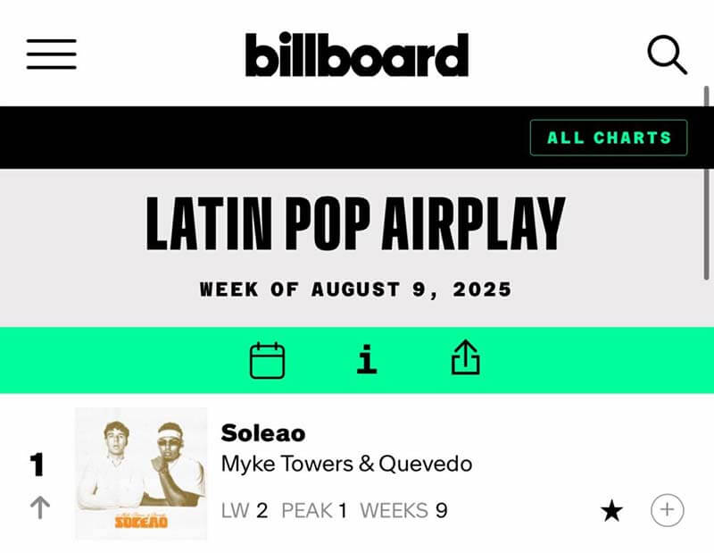 Esta semana, “Soleao” se posicionó simultáneamente en el #1 del Latin Airplay, Latin Pop Airplay y Latin Rhythm Airplay, confirmando el alcance multigénero y global del sencillo. Este hecho convierte a “Soleao” en el 18.º #1 de Myke en el chart Latin Airplay. La semana pasada, el tema ya había alcanzado el primer lugar en el Latin Rhythm Airplay, marcando el 16.º #1 de Myke Towers en ese chart. Con este nuevo triple #1, el éxito reafirma su dominio en la radio latina y su conexión masiva con el público.
