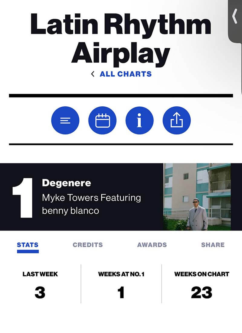 Myke Towers está viviendo uno de los momentos más electrizantes de su carrera. Esta semana, el ícono puertorriqueño no solo reafirma su dominio en la música urbana, sino que consolida su presencia en los charts más importantes de la industria. Su tema “Degenere”, en colaboración con el reconocido productor benny blanco, se apodera del puesto #1 tanto en el Latin Airplay Chart como en el Latin Rhythm Airplay Chart de Billboard, marcando su 17º #1 en Billboard y confirmando la potencia de su propuesta sonora. Además, el sencillo aterrizó en el #1 del Mediabase Spanish Contemporary Chartposicionándolo firmemente entre los temas más escuchados en la radio y consolidándolo como uno de los artistas con más temas #1 en Mediabase.