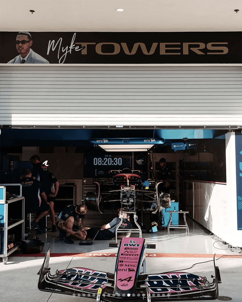 En una integración sin precedentes, el Grand Prix de Miami 2025 reemplazó los nombres de los pilotos sobre los garajes por los nombres de los artistas que forman parte del soundtrack oficial de la película. El nombre de Myke Towers fue exhibido de forma destacada sobre el garaje del equipo BWT Alpine de Fórmula 1, junto a las estrellas internacionales del álbum. Su presencia quedó integrada de manera visible y significativa en el corazón del circuito. El paddock se transformó en una galería viva donde el cine, el deporte y la música convergieron con intención narrativa.