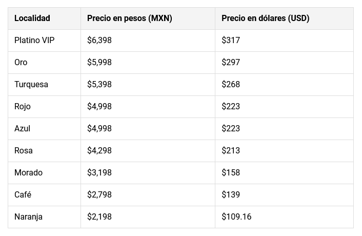 La preventa de boletos comenzará el 10 de diciembre para abonados, mientras que la venta general estará disponible a partir del 16 de diciembre. Aquí están los precios para la serie completa de dos juegos: